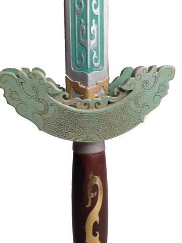 Screen used "Green Destiny" sword. Sword is a silver resin blade with green design. The handle is green resin dragon body with two dragon heads, brown resin grip and gold design with a  green decorative tip at the bottom of the handle. This is the main sword in the film. (40x5) After eighteen years of solitude, renowned warrior-maiden Shu Lien emerges from retirement and travels to Peking, where the Green Destiny—the legendary sword of her deceased love Li Mu Bai—is located. This is the legendary sword that the film is based upon - do not miss this opportunity to own it!! Replicas of this sword cannot be compared!