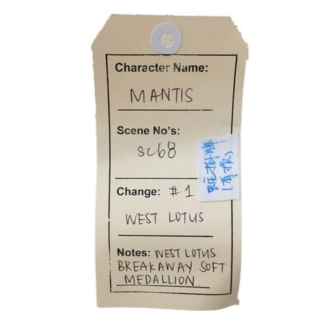 Mantis (Veronica Ngo) screen worn, hero, West Lotus medallion labeled "Breakaway soft medallion". Metal medallion with a circular snake design with open mouth and exposed fangs, black leather string used to tie around the neck. (2x3)