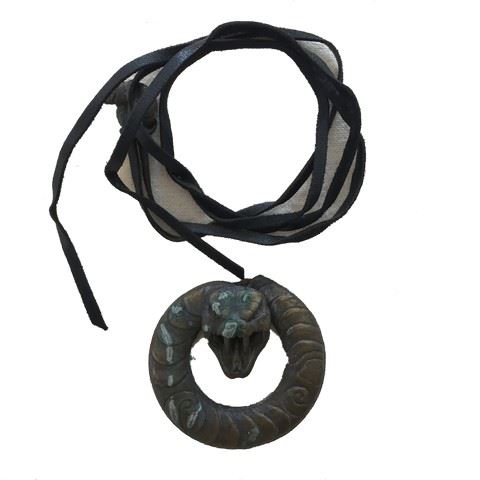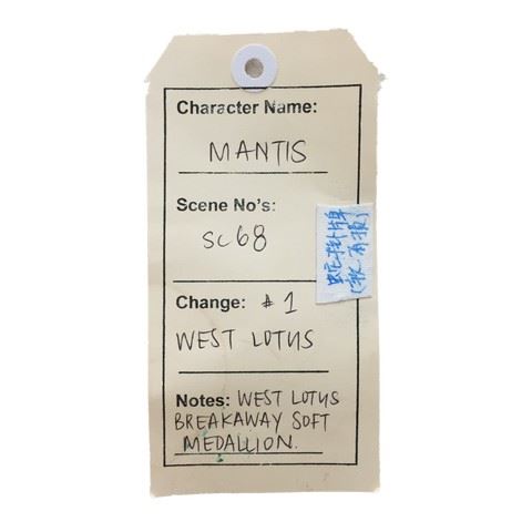 Mantis (Veronica Ngo) screen worn, hero, labeled "#1 West Lotus", breakaway soft medallion, circular snake design with open mouth and exposed fangs, worn in scene 68. (2x3).