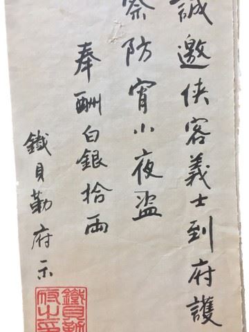 Screen used, hero, in the tea house, "Swordsman Wanted" poster from scene 20, on rice paper with black ink. (22x11) May vary slighltly in appeance.