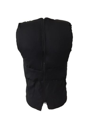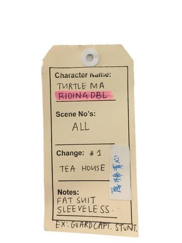 Turtle Ma (Darryl Quon) screen worn, riding dbl, black sleeveless fat suit, guard captain stunt. Worn in the tea house scene. Wardrobe tag included.
