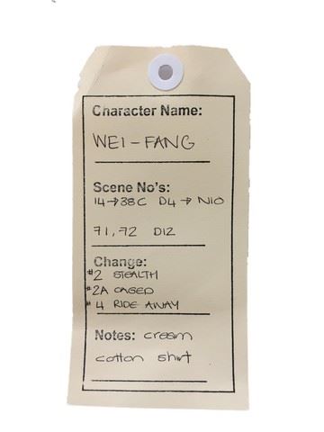 Wei-Fang (Harry Shum Jr.) screen worn, stunt,cream linen shirt. Wardrobe tag included. Worn in scenes 14-38, 71-72.