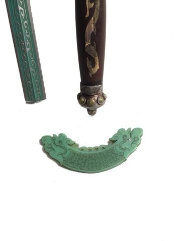 Screen used, "Green Destiny" sword, silver alloy blade with green design, the handle is green with brown resin grip and gold design, the sword has been broken in half by production, green handle is also been broken off by production.(26x5)