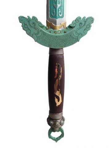 Screen used, stunt,"Green Destiny" sword with foam blade with green design and foam handle. Handle is green with brown resin grip and gold design with jade cross guard in the shape of a dragon. Tip of the sword is foam for stunt scenes.(40x5)