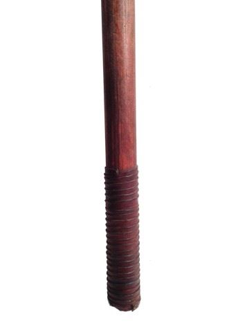 Screen used, rubber, hand held sickle like weapon with wood handle and leather grip (16"x7").