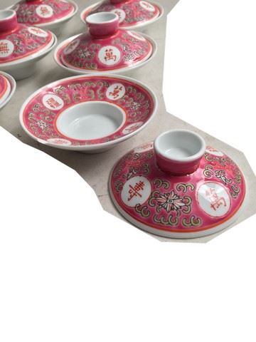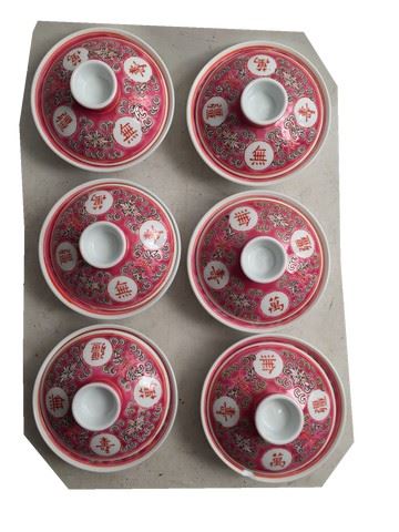 Screen used tea bowls from the Tea house. Set of 6 - includes 6 bowls and 6 lids. Beautiful, hand painted with writing and pink and gold design.(4x3 each)