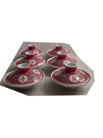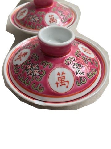 Screen used tea bowls from the Tea house. Set of 6 - includes 6 bowls and 6 lids. Beautiful, hand painted with writing and pink and gold design.(4x3 each)