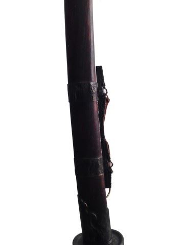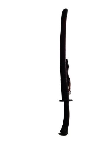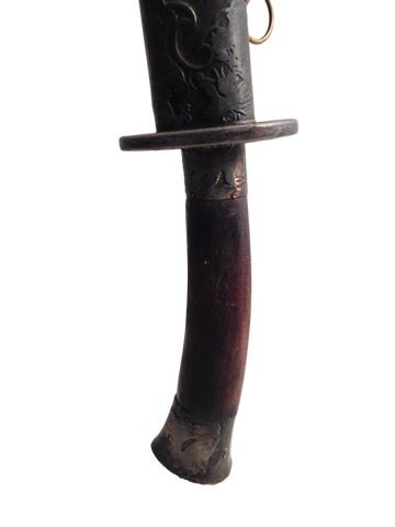 Screen used, hero, Yanmaodao sword and scabbard with a brown leather strap. Scabbard is brown wood with tarnished copper accents. The metal sword is slightly tarnished. Handle is wood and copper. This is a type of dao used as a standard military weapon during the Ming Dynasty and middle Qing Dynasty (1368–1800). This saber has a blade that is nearly straight for its entire length except for the tip, which curves. (37x4)