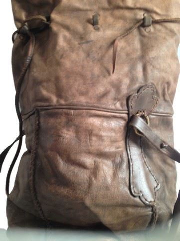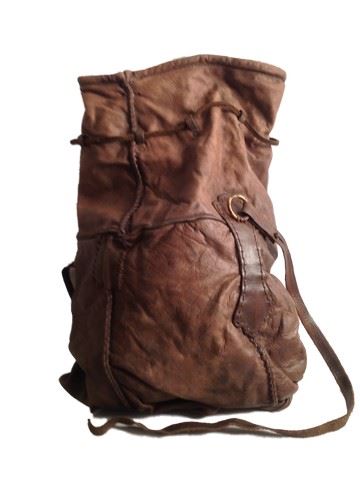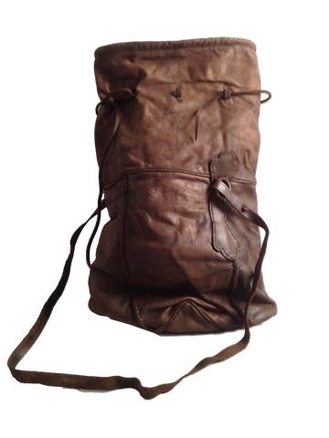 Screen used, brown leather bag with one singular strap to go around the body, brown leather straps to synch at the top of the bag to close it, gold satin lining with a clover like design, gold ring at the front and back that the strap hooks to.(19x11).