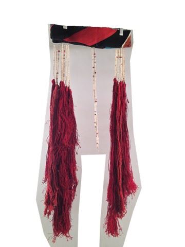Blind Enchantress (Eugenia Yuan) screen worn, burgundy burlap cloak with a beaded design, black silk under shirt with a tie at the right side, long flowing black pleated skirt that fastens in the back, long dangling silver earrings, red and white beaded belt with crocheted design, and black suede and leather wrist guards with beads and strings attached. Wardrobe tag included.