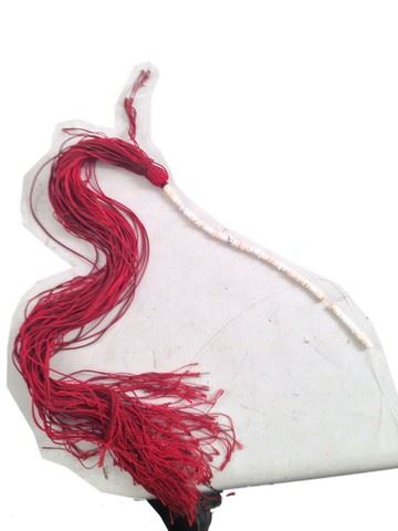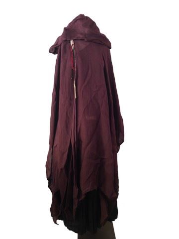 Blind Enchantress (Eugenia Yuan) screen worn, burgundy burlap cloak with a beaded design, black silk under shirt with a tie at the right side, long flowing black pleated skirt that fastens in the back, long dangling silver earrings, red and white beaded belt with crocheted design, and black suede and leather wrist guards with beads and strings attached. Wardrobe tag included.