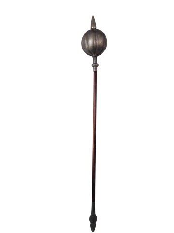 Screen used, stunt club, brown wooden handle with a large bulbous end made of foam and silver in color, this is called a "septre" by production, on top of the round end is a spear tip and the other end is a spear tip only.(75x10), large bulbous end.