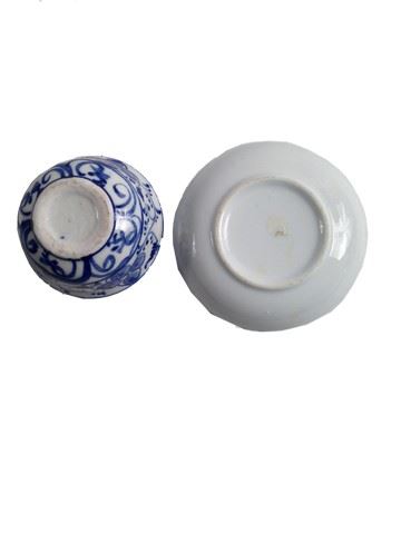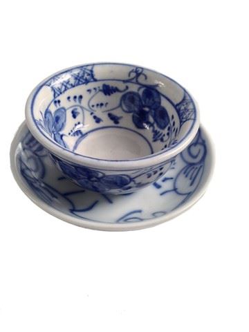Screen used, Great Hall drinking crockery. One hand made ceramic and glazed blue and white cup and saucer with hand painted design.(4x2).