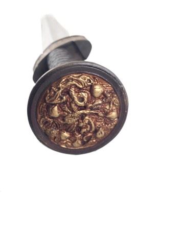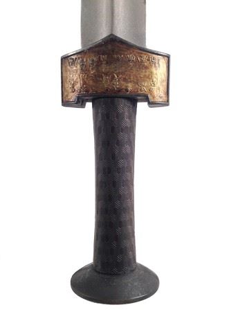 Screen used, stunt Dao, silver and gold sword with darker more tarnished looking silver around handle. Has a gold design on the bottom of the handle. Made of a resin material. (27x3)