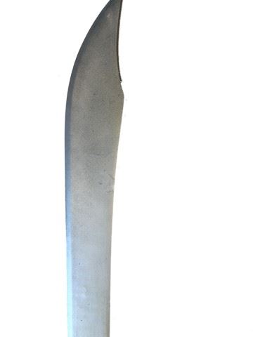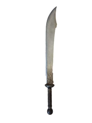 Silver resin sword with brown cord wrapped grips and intricate flame design on the end of the sword near the grip. Flame design also on the top of the handle. (36"x4")