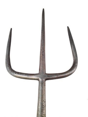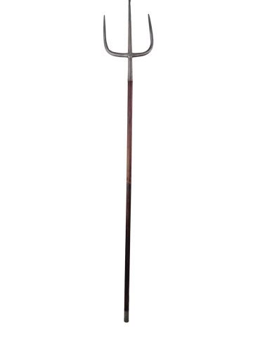 Screen used, stunt, fork spear (rubber and aluminum). Pitch fork shaped tip and blunt at the other end with a wooden handle. Used for fighting scenes.(76x2)