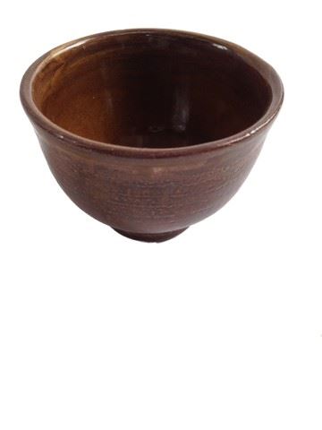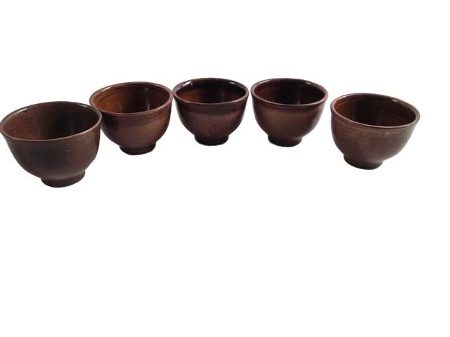 Screen used Great Hall drinking crockery. Five hand made ceramic and glazed brown cups. Each cup is painted slightly differently.(3x2)