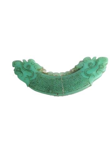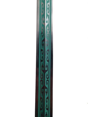 Screen used "Green Destiny" sword, tai chi blade. The handle is green with brown resin grip and gold design. Part of the green handle is broken off on one side with a green decorative tip at the bottom of the handle.(40"x5")
