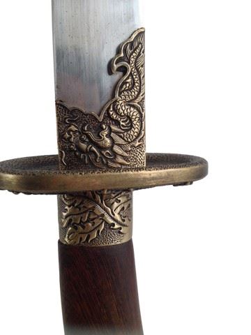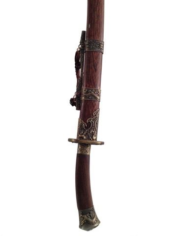 Guard Captain (Trevor Sai Louie) screen used, hero, Dao is brown wood with silver metal and gold metal around handle and sheath, gold metal design with dragons and roosters on handle and base, sheath is made of wood and has same design as the base and handle of the sword, it also has a leather strap to hold. (37x4).