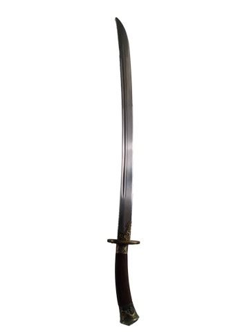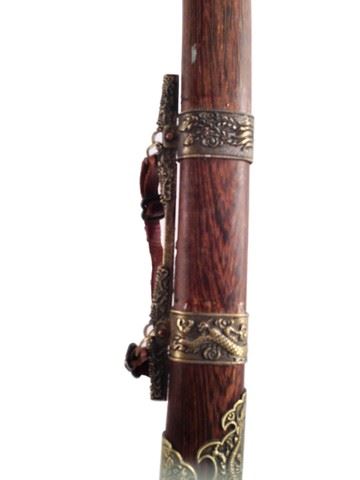 Guard Captain (Trevor Sai Louie) screen used, hero, Dao is brown wood with silver metal and gold metal around handle and sheath, gold metal design with dragons and roosters on handle and base, sheath is made of wood and has same design as the base and handle of the sword, it also has a leather strap to hold. (37x4).