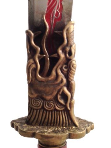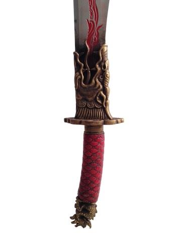 Hades Dai (Jason Scott Lee) screen used Hell Fire sword. Blade is made of resin with a jagged like edge on one side. Sword hilt is a dragon face design with open mouth leading into the red etched design down the sword blade to symbolize fire out of the mouth of the dragon. (39x5)