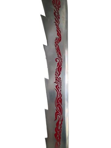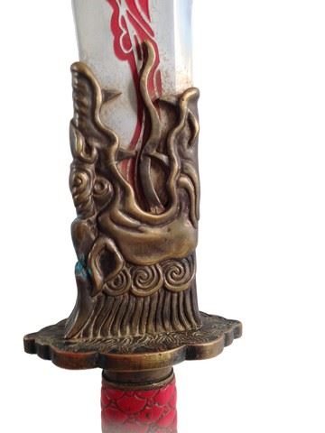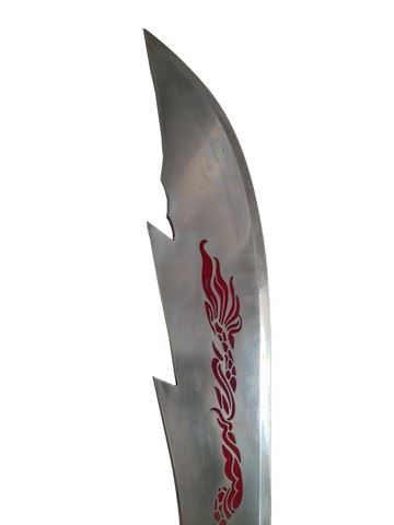 Hades Dai (Jason Scott Lee) screen used, hero, Hell Fire blade and sheath. Sword is made of metal and sheath is a plastic material with some metal. Sword is silver with a red design down the center and it has a jagged like edge on one side to symbolize fire. Sheath is red and bronze with a pattern. Dragon design at the edge of the sword near the handle.(39x5)