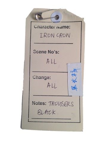 Iron Crow (Roger Yuan) screen worn, hero, cotton saffron colored under robe with buttons, cotton saffron waist wrap, and black silk trousers. All items are marked with "Iron Crow" on the label and include wardrobe tags.