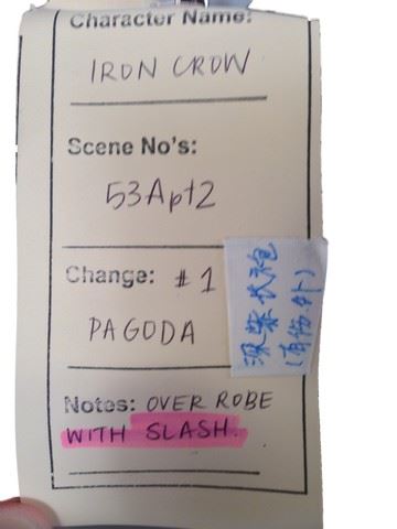 Iron Crow (Roger Yuan) screen worn, hero, cotton, purple colored over robe that ties on the inside of the robe and buttons on the ouside. Robe has been slashed by a blade during production and the inside has blood stains in the wound area. All items are marked with "Iron Crow" on the label. Includes wardrobe tags.