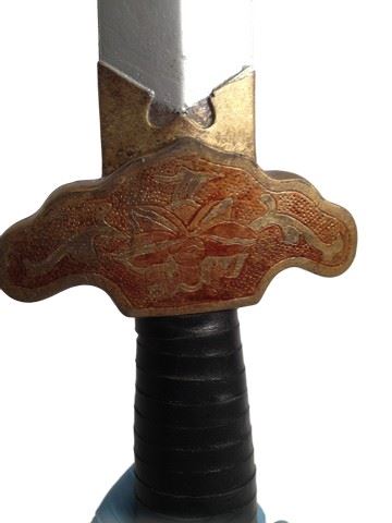 Screen used, stunt Jian - silver aluminum blade with a gold and leather handle, top and bottom of handle has an intercut design.(38x4)