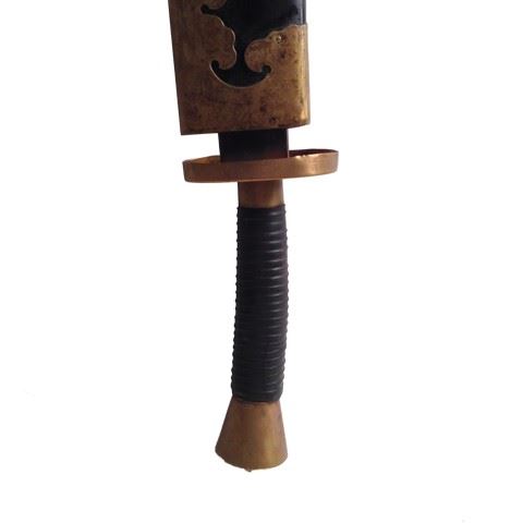 Mantis (Veronica Ngo) screen used, hero metal and copper dao (sword) with scabbard. Scabbard is black metal with copper accent and leather hand strap. Sword is metal, slightly tarnished with a leather woven grip. (37"x4")