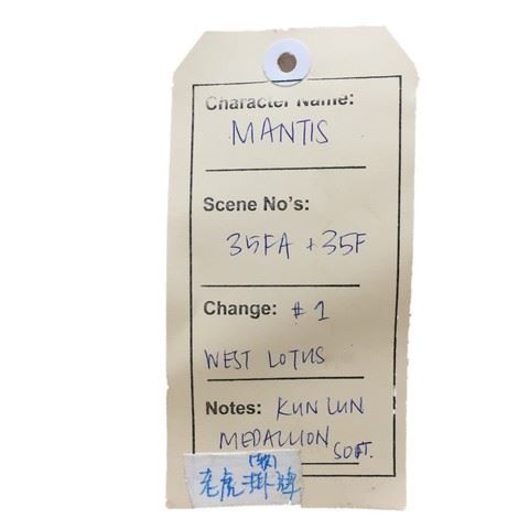 Mantis (Veronica Ngo) screen worn, stunt, Kun Lun medallion soft, labeled "#1 West Lotus" used in scenes 35FA, 35F. (2x3).
