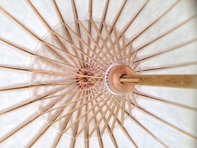 Screen used umbrella, used in the funeral scene. It is a hand made of bamboo, wood ,wax and thick paper that is also covered in wax. Umbrella is off white and brown. When it opens, the inside is white and string is knitted into a beautiful design. This is a functioning umbrella but is also a amazing piece of art. There are string tassels on each piece. (26x3) Comes with a label that reads funeral extra parasol #4.