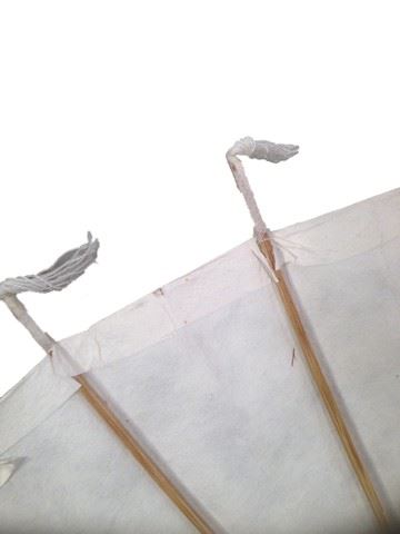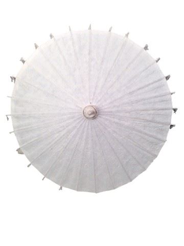 Screen used umbrella, used in the funeral scene. It is a hand made of bamboo, wood ,wax and thick paper that is also covered in wax. Umbrella is off white and brown. When it opens, the inside is white and string is knitted into a beautiful design. This is a functioning umbrella but is also a amazing piece of art. There are string tassels on each piece. (26x3) Comes with a label that reads funeral extra parasol #4.