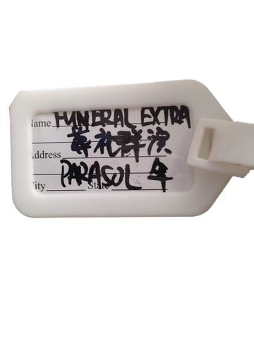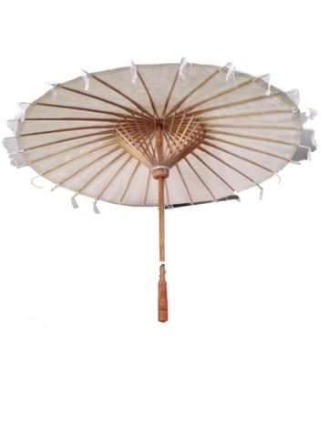 Screen used umbrella, used in the funeral scene. It is a hand made of bamboo, wood ,wax and thick paper that is also covered in wax. Umbrella is off white and brown. When it opens, the inside is white and string is knitted into a beautiful design. This is a functioning umbrella but is also a amazing piece of art. There are string tassels on each piece. (26x3) Comes with a label that reads funeral extra parasol #4.