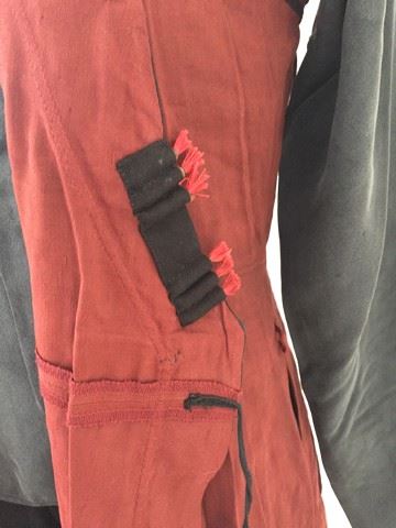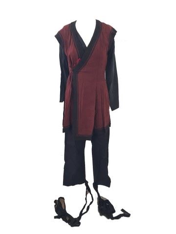 Silver Dart Shi (Juju Chan) screenworn, hero, custom made black undershirt with custom made burgundy vest with darts on the inside. Also includes a pair of matching black pants. Wardrobe tag for the undershirt included.