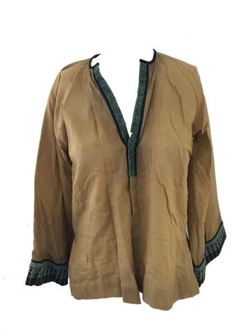 Silver Dart Shi (Juju Chan) screenworn, hero #2 of 3 custom made, mustard colored, Asian inspired tunic with black trim and green Asian print down the center and around the cuffs. Wardrobe tag included.