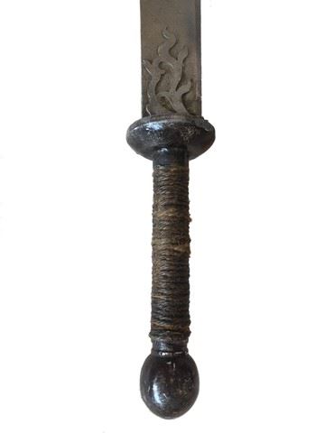 Silver colored resin sword with brown cord wrapped grips and intricate flame design on the end of the sword near the grip, flame design also on the top of the handle, the blade is production cut and worn.(36x4)