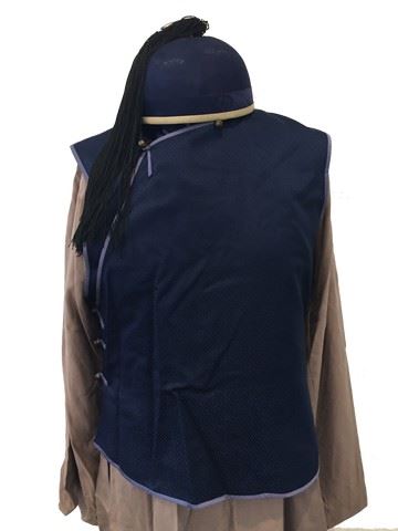 Te Junior (Gary Young) screen worn, hero funeral costume. Costume includes blue with grid design waistcoat vest with dark tan undershirt and dark brown trousers. Includes a blue nobleman's hat and wardrobe tags. Waist wrap included.
