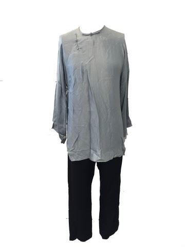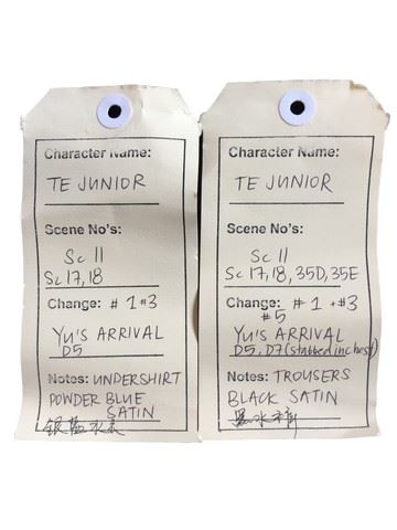Te Junior (Gary Young) screen worn, hero powder blue undershirt and black satin trouser. Worn during the scene of Yu's arrival. Includes wardrobe tags.