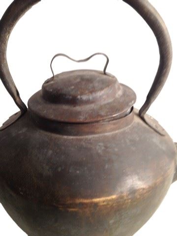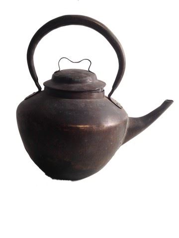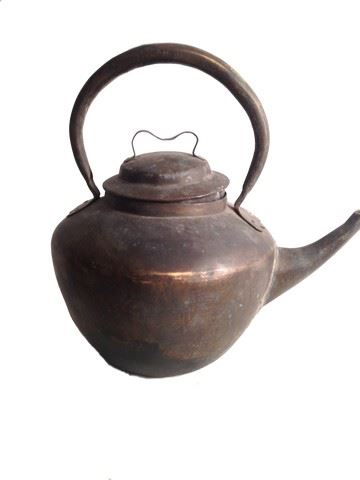 Screen used, brown and gold metal tea pot, used by the tea house lady, large pot with lid and pouring spout.(13x11)