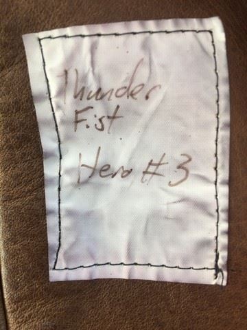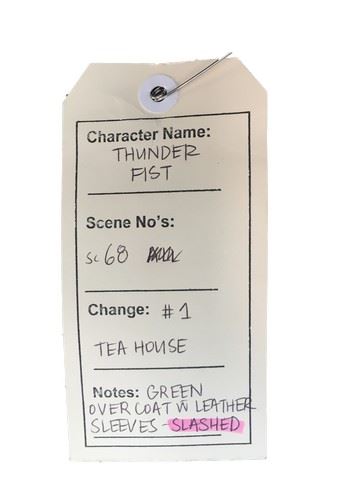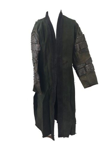 Thunder Fist (Woon Young Park) screenworn, hero, green with leather plates on the arms full length canvas trenchcoat. Includes wardrobe tag, worn in scene 68. Over coat sleeves have been slashed by production. Inside label reads "Thunder Fist Hero #3.