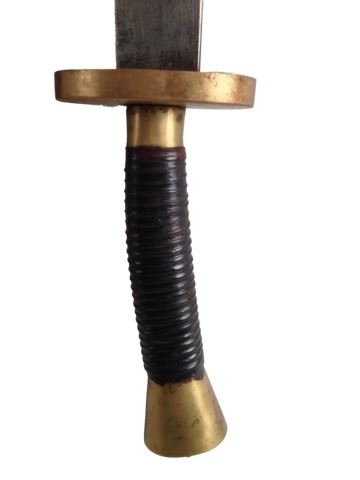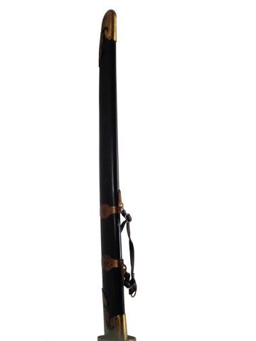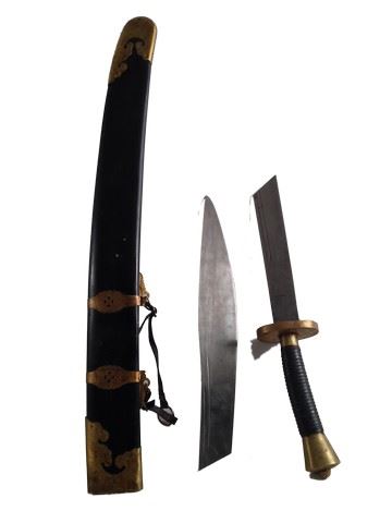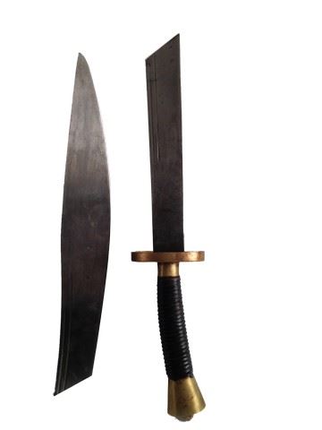 Screen used, hero Dao used for training. Sword has a long handle wrapped in leather and gold aluminum with metal blade. Blade has been cut down during production. Sheath is aluminum with a leather strap.(37"x4")