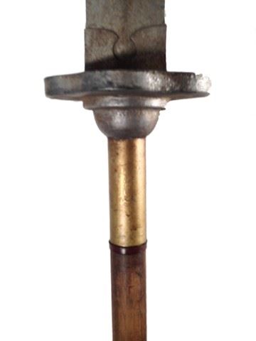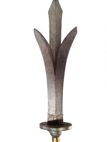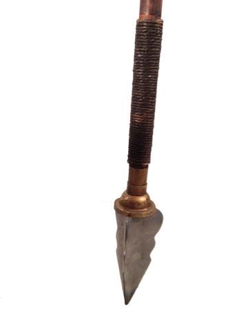 Tri-tip, double ended spear made of resin with a wood handle. The other end is a three-sided, resin, dagger style tip with a woven rope grip. (77"x7")
