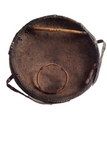 Turtle Ma (Darryl Quon) screen used, hero shield made of bamboo burlap and wicker. Wicker and bamboo have been painted a very dark brown color which shows worn from production. Bamboo handles on the inside of the shield.(20x20)