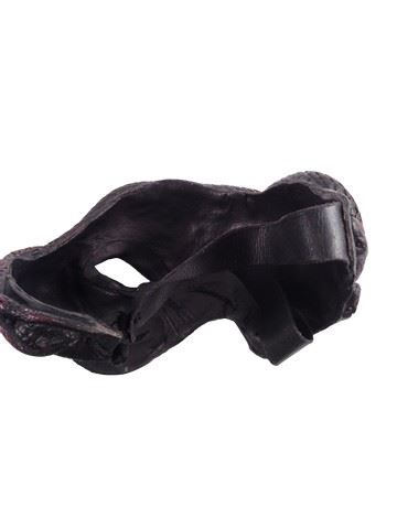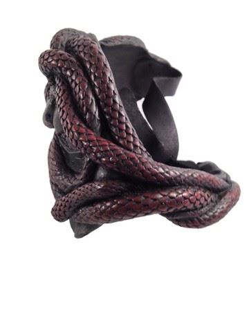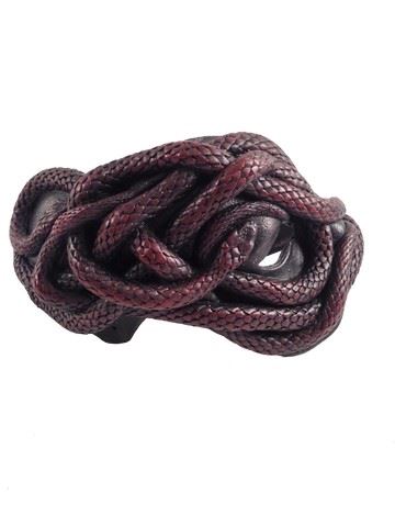 Screen used warrior half mask made of painted leather and rubber material. Maroon and black in color. Mask is covered in a snake design with only one eye hole. (6"x9")