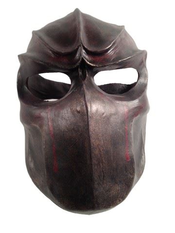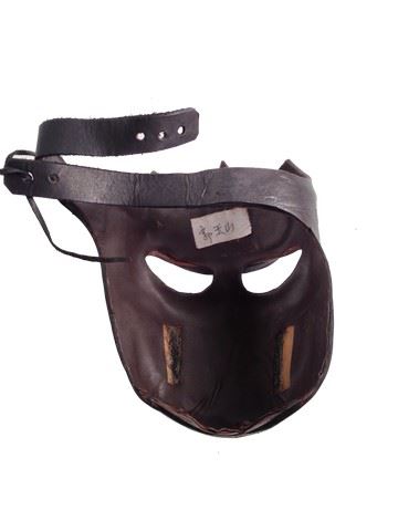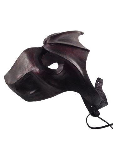Screen used, warrior mask made of painted leather and rubber material. Maroon and black color. Mask has a skull design and does not have a mouth opening (only vented slots near the mouth for breathing). (6"x9")