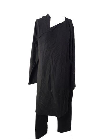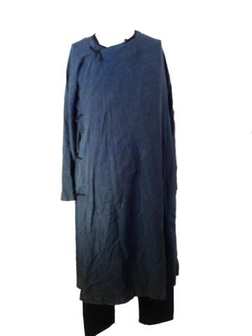 Wei-Fang (Harry Shum Jr) screen worn west lotus mask (made of leather and rubber) with black scarf attached. Scarf fits over the mouth and bottom of the face. Blue linen over robe that buttons up the side and black cotton under robe that buttons up the side complete the look along with a black cotton waist wrap and black cotton elastic waist band pants. Worn in the final fight scene at the frozen lake. Wardrobe tags included.