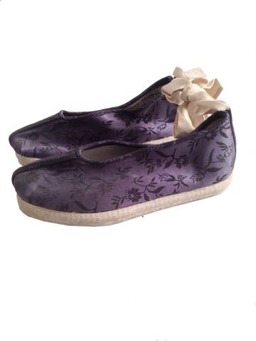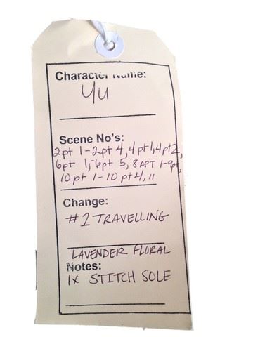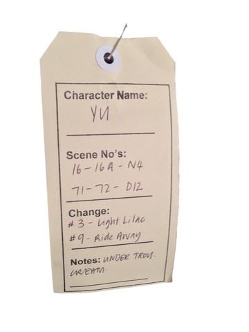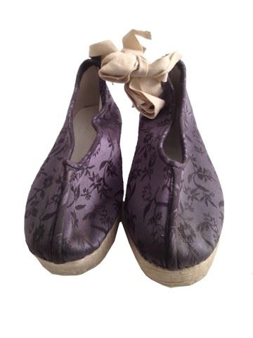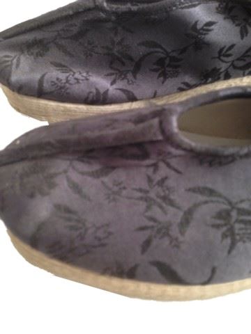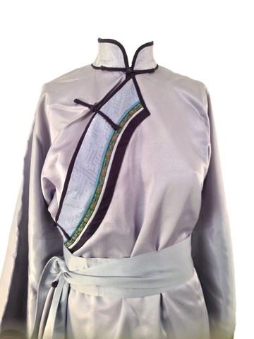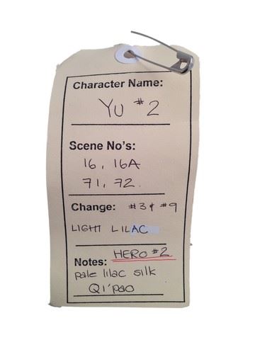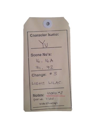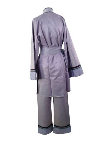 Yu (Michelle Yeoh) screen worn, hero, light lilac suit with dark purple trim, made of silk with buttons up the side on the top and an elastic waist band on the pants, with a lilac waist wrap. Wardrobe tag included. Worn in the traveling scene. Inside tag reads "hero #2". Lavender floral shoes, satin and canvas bottom.
