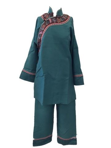Yu (Michelle Yeoh) screen worn, two piece wardrobe collection. The costume includes a turquoise silk Qi pao over robe trimmed in rose and burgandy flowers, turquoise trousers with an elastic waistband and rose and powered blue trim. Labeled #1, from the final fight scene.