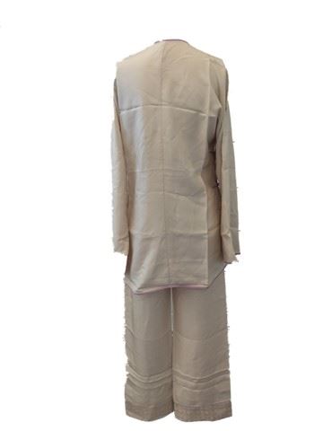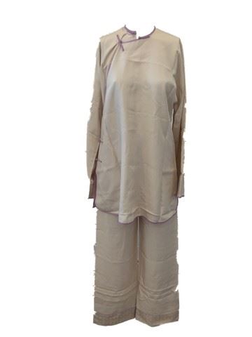 Yu (Michelle Yeoh) screen worn, two piece wardrobe collection. The costume includes a beige and lilac trimmed pajama top with matching elastic waistband pants.